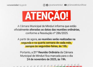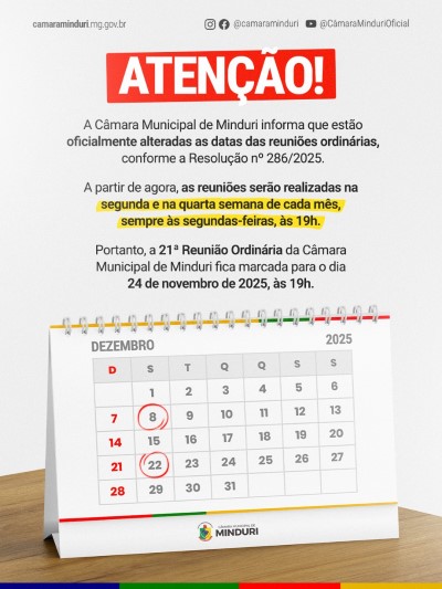 A Câmara Municipal informa a alteração oficial das datas das Reuniões Ordinárias. De acordo com a Resolução nº 286/2025, as reuniões passam a ser realizadas na segunda e na quarta semana de cada mês,...