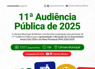 A Câmara Municipal de Minduri convida toda a população para participar da 11ª Audiência Pública para a apresentação e discussão da Lei Orçamentária Anual (LOA) 2026 e do Plano Plurianual (PPA) 2026/2029. 📅 17 de...