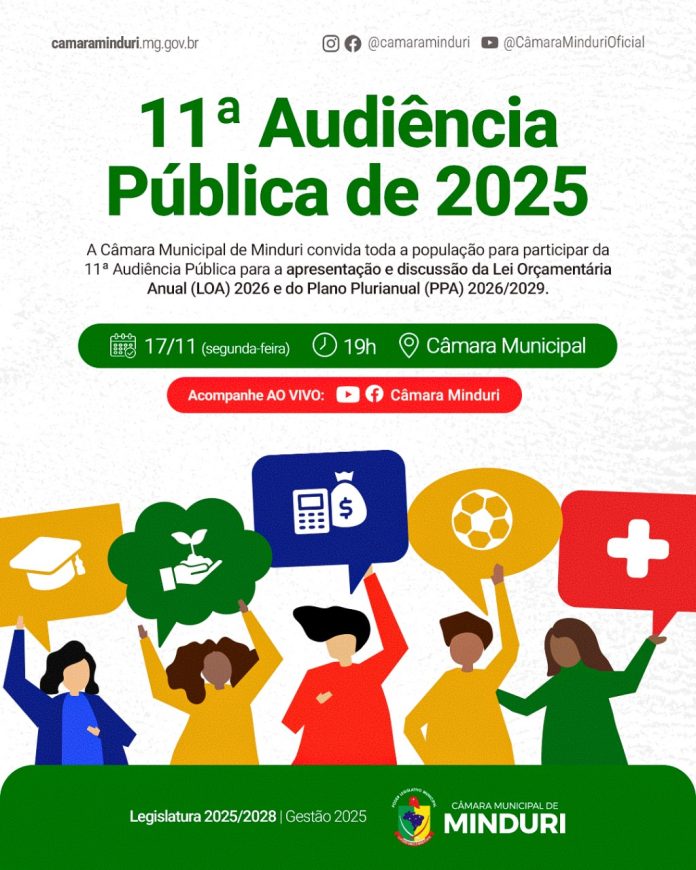 A Câmara Municipal de Minduri convida toda a população para participar da 11ª Audiência Pública para a apresentação e discussão da Lei Orçamentária Anual (LOA) 2026 e do Plano Plurianual (PPA) 2026/2029.