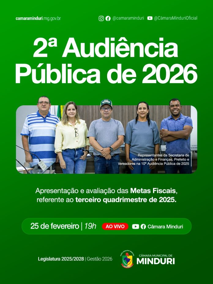 A Câmara Municipal de Minduri convida toda a população para a 2ª Audiência Pública de 2026, onde será apresentado o Relatório de Avaliação do Cumprimento das Metas Fiscais do 3º quadrimestre de 2025.