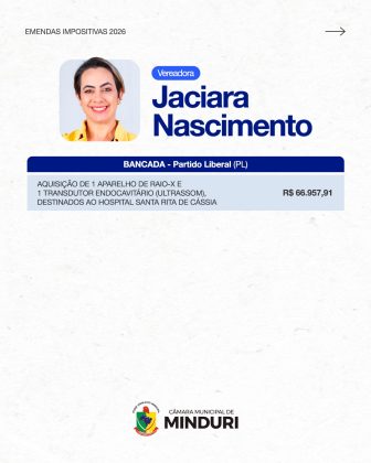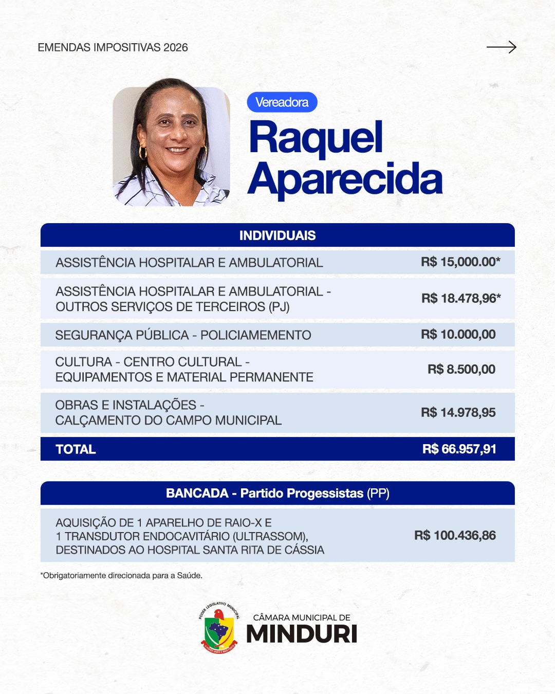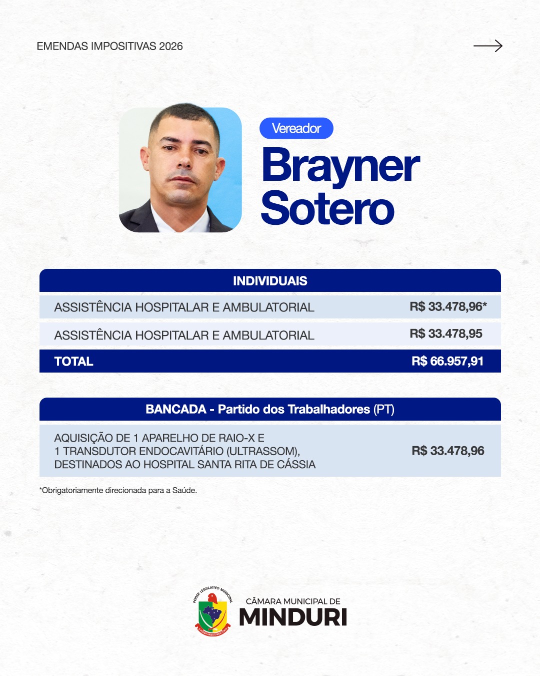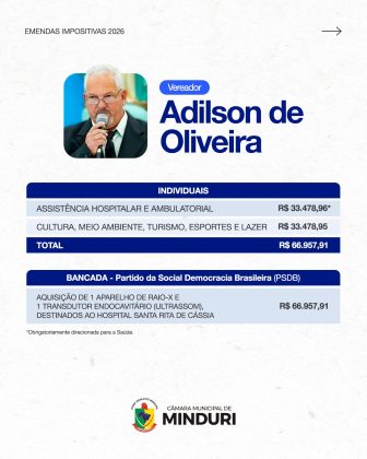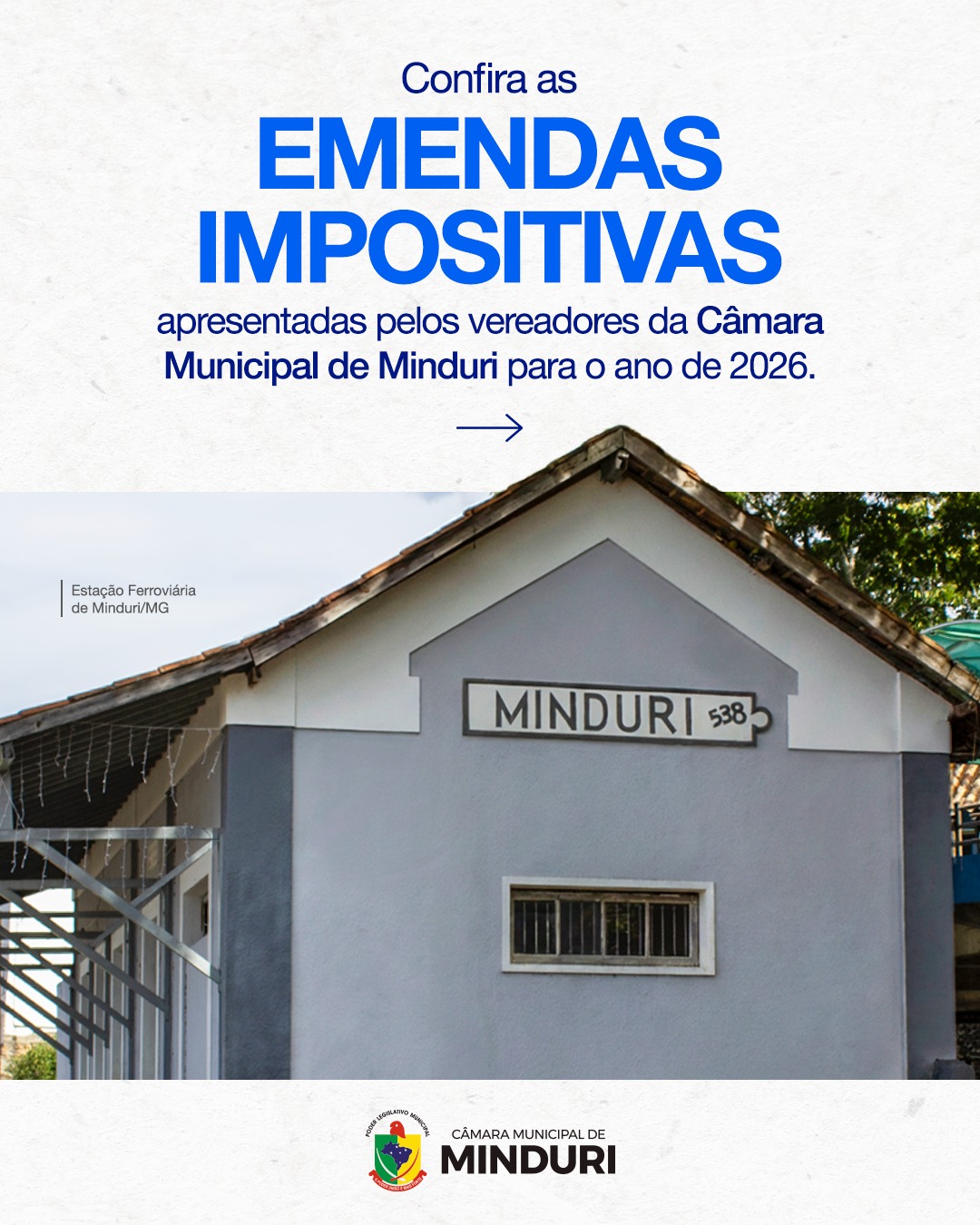 A Câmara Municipal de Minduri apresenta as emendas impositivas dos vereadores, aprovadas ao final de 2025, que passam a integrar oficialmente o Orçamento Municipal de 2026.