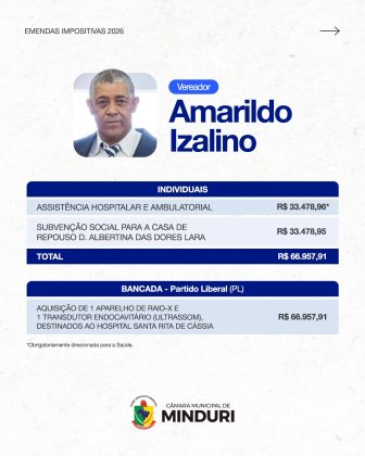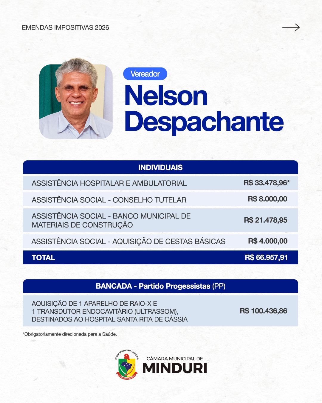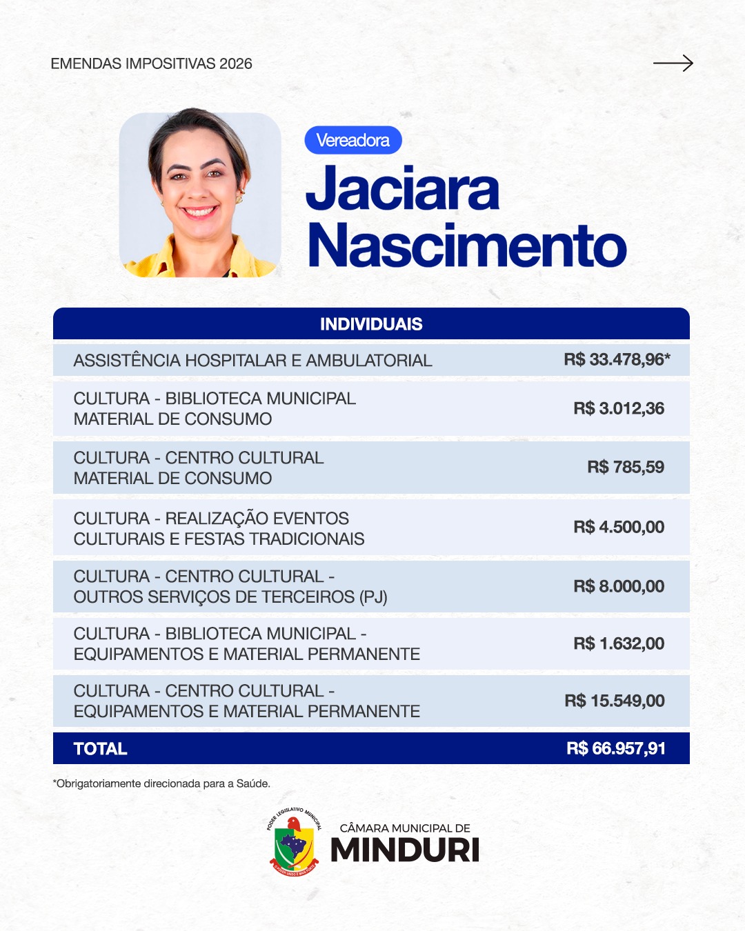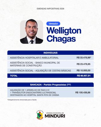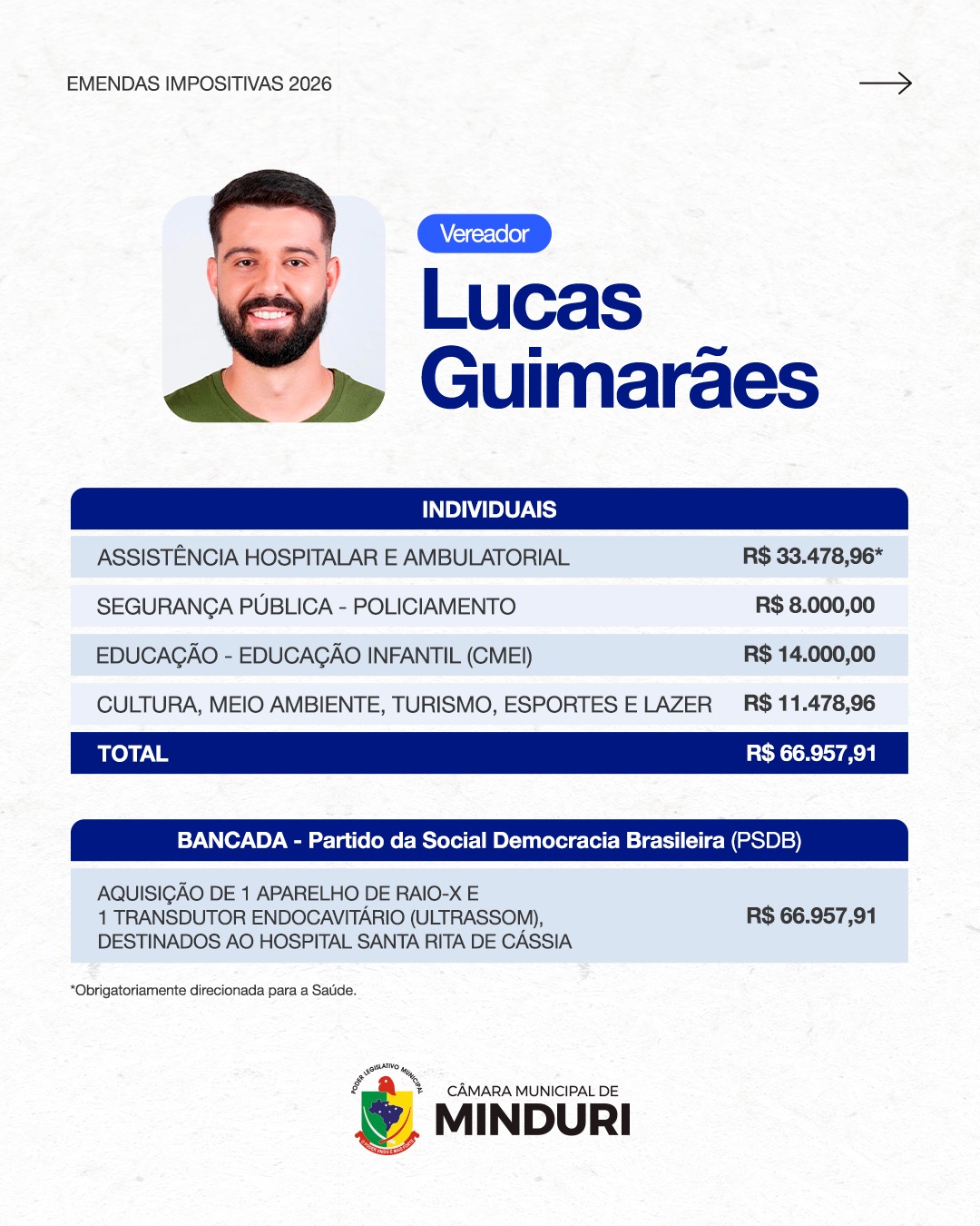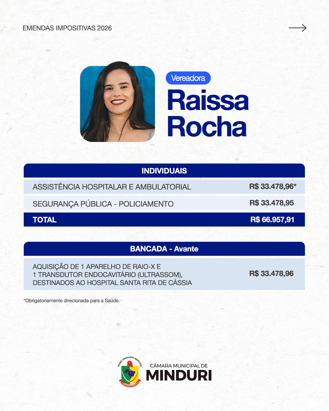 A Câmara Municipal de Minduri apresenta as emendas impositivas dos vereadores, aprovadas ao final de 2025, que passam a integrar oficialmente o Orçamento Municipal de 2026.