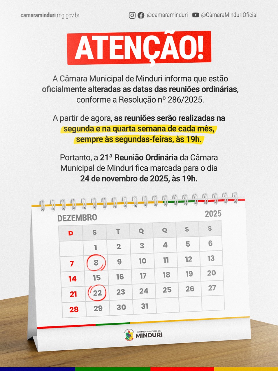 A Câmara Municipal informa a alteração oficial das datas das Reuniões Ordinárias. De acordo com a Resolução nº 286/2025, as reuniões passam a ser realizadas na segunda e na quarta semana de cada mês, sempre às segundas-feiras, às 19h.